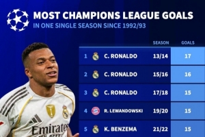 体育资讯1月29日讯 德国转会市场统计了192-1993赛季欧冠改制以来球员单赛季进球数量,并列出榜单,13-14赛季C罗17球居首,本赛季姆巴佩13球并列第7。