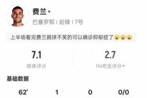 体育资讯2月1日讯 西甲第22轮,巴萨客战埃尔切。费兰·托雷斯首发出战,打进1球,1次过人成功,但3次错失进球机会,2次射中门框,评分7.1。