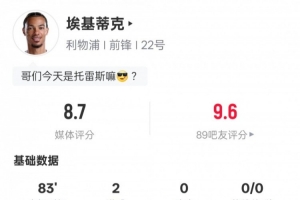 体育资讯2月1日讯 英超第24轮,利物浦主场迎战纽卡斯尔。埃基蒂克首发出战,6次射门4次射正,贡献双响,也错失2次进球机会,评分8.7。