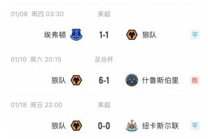 近4轮英超,狼队先后战平曼联、埃弗顿和纽卡三支劲敌,并3-0大胜保级对手西汉姆联。