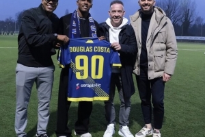 斯基拉写道:“道格拉斯·科斯塔与切沃签约后的首张照片,双方签约至6月,在那之后他将加盟阿联酋球队伊蒂法克,并签约至2028年。”