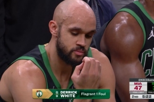 GIF-怀特扑防鲍威尔三分犯规,裁判回看升级一级恶意,解说说这是怀特生涯第一个恶意犯规