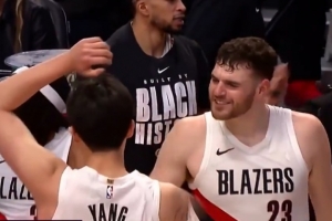 GIF-杨瀚森险被隔扣 克林根击掌鼓励小杨