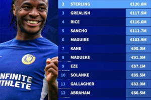 英格兰球员职业生涯转会费排行:斯特林1.206亿欧,仅次贝林厄姆