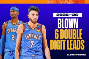 体育资讯2月21日讯 据美媒ClutchPoints统计,上赛季,雷霆在夺冠的历程中(常规赛+季后赛)一共仅5次在手握两位数领先的情况下被逆转。