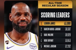 在本场比赛中,詹姆斯常规赛生涯总得分突破43000里程碑,赛后他转发了个人海报,并写道:“继续前进👑。”