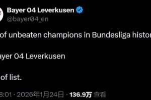 体育资讯1月25日讯 在拜仁1-2输给奥格斯堡后,勒沃库森官方更新社交媒体。
